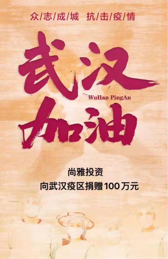 1月27日,面对严峻的肺炎疫情,尚雅投资紧急启动决策流程。经董事会审议通过,公司决定向武汉疫区捐赠100万元,用于支持武汉市抗击新型冠状病毒肺炎工作。
