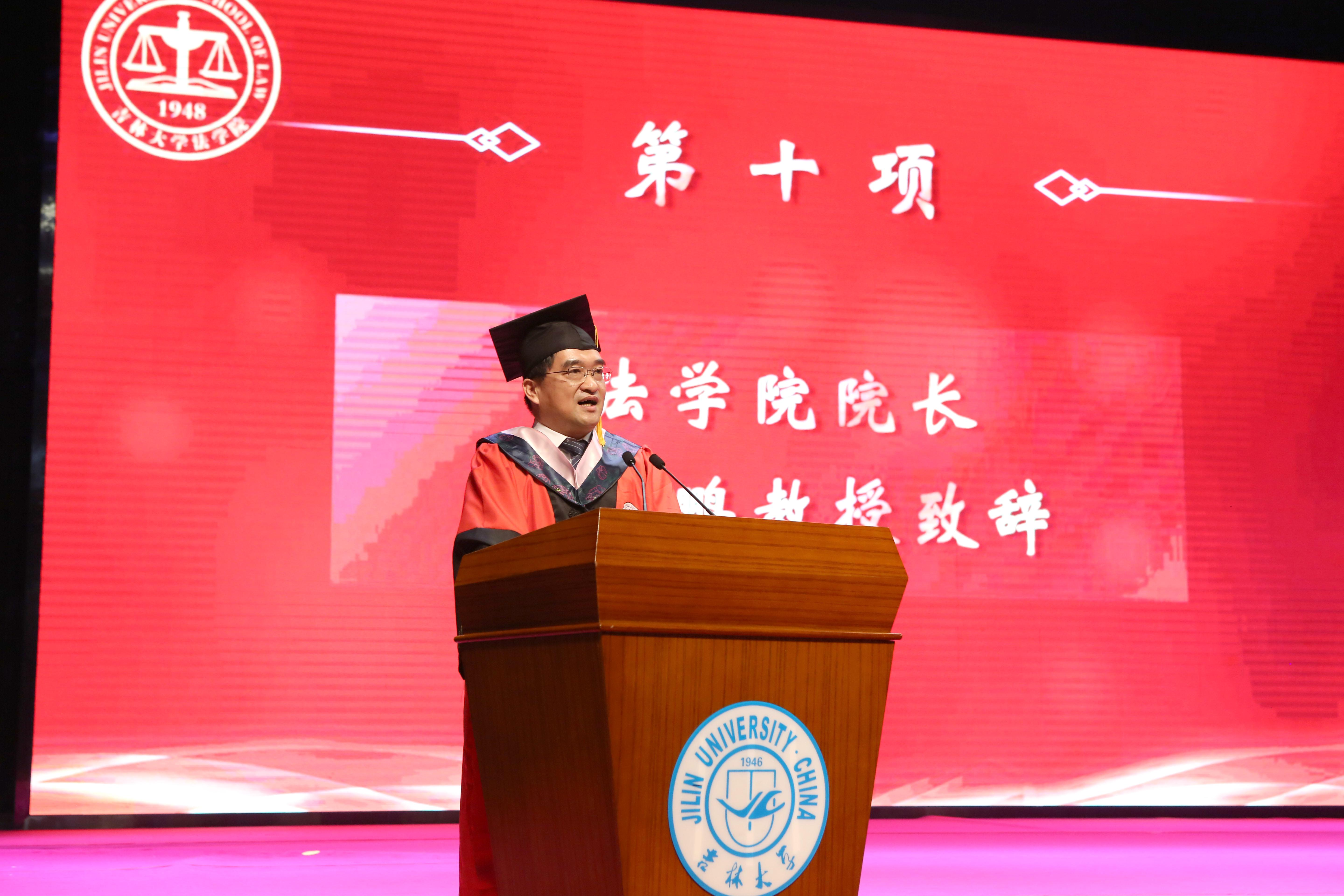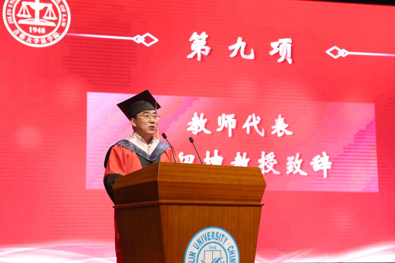 校务委员会副主任,财产法研究中心主任房绍坤教授作为教师代表致辞。他以“风物长宜放眼量”为主题,与同学们分享了对当代社会“内卷”与“躺平”的看法。他勉励同学们要放眼将来,志存高远,拒绝“内卷”与“躺平”,带着成人抖音