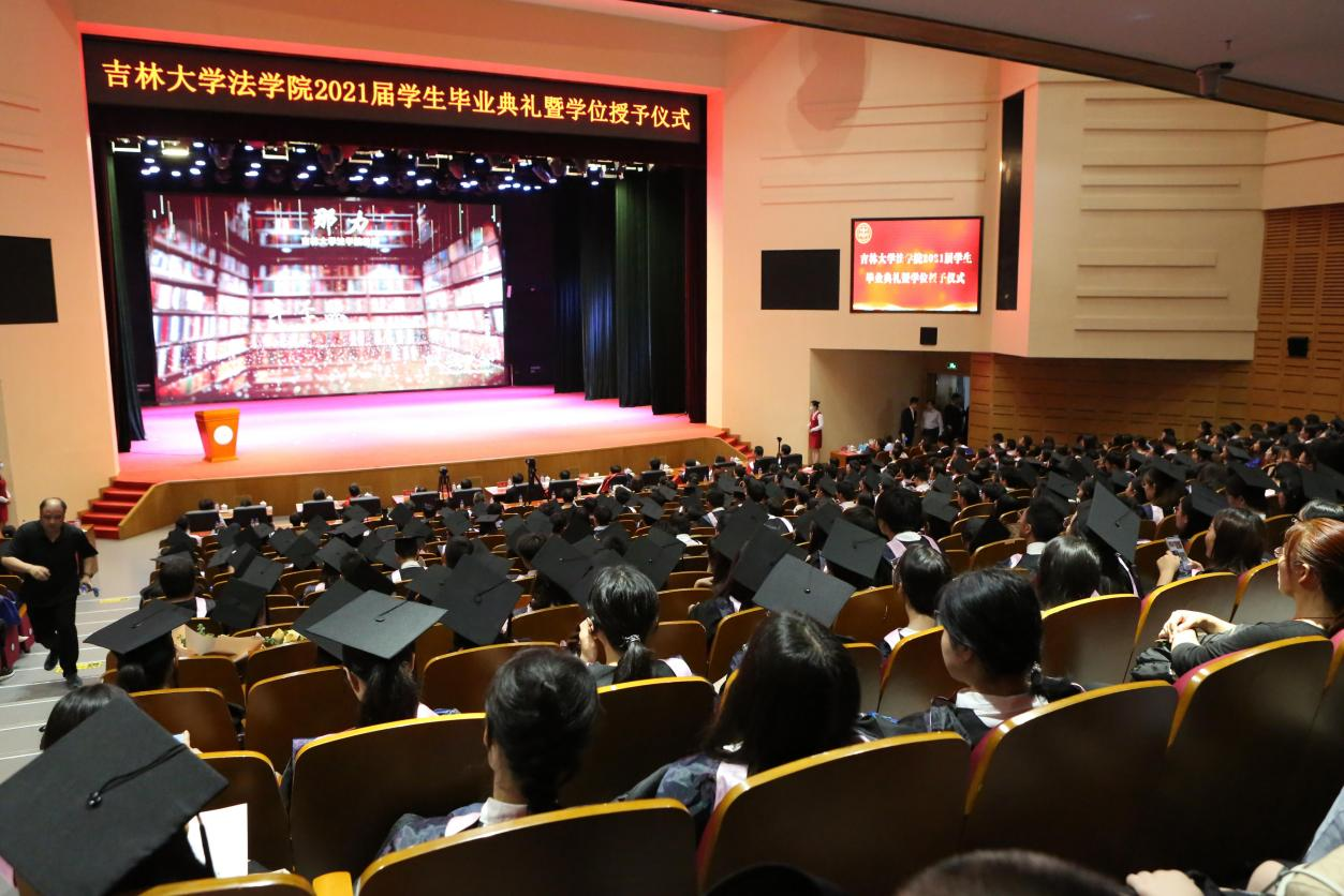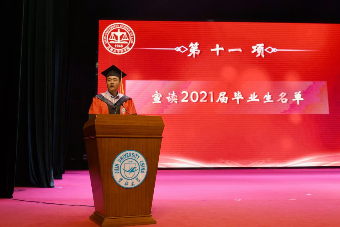 副院长刘晓林教授宣读毕业生名单后,院长何志鹏教授、院党委书记周春国教授、法学学位评定分委员会副主席张旭教授、校政策与法规办公室主任任喜荣教授、理论法学研究中心主任兼副院长杜宴林教授、副院长曹险峰教授、王充教授、刘晓林教授等八位主礼教授登台为毕业生拨穗授位,获得学士、硕士、博士学位的2021届毕业生们依次登台接受拨穗礼。
