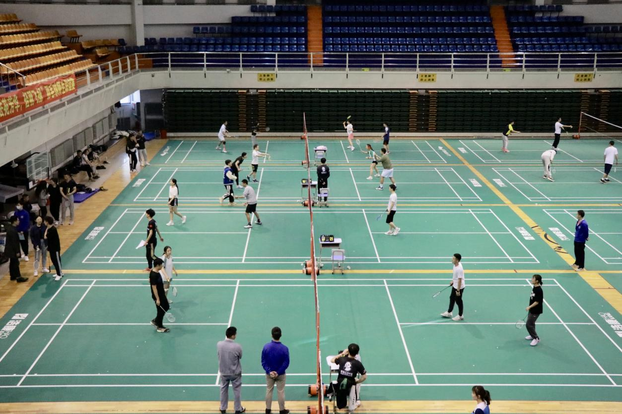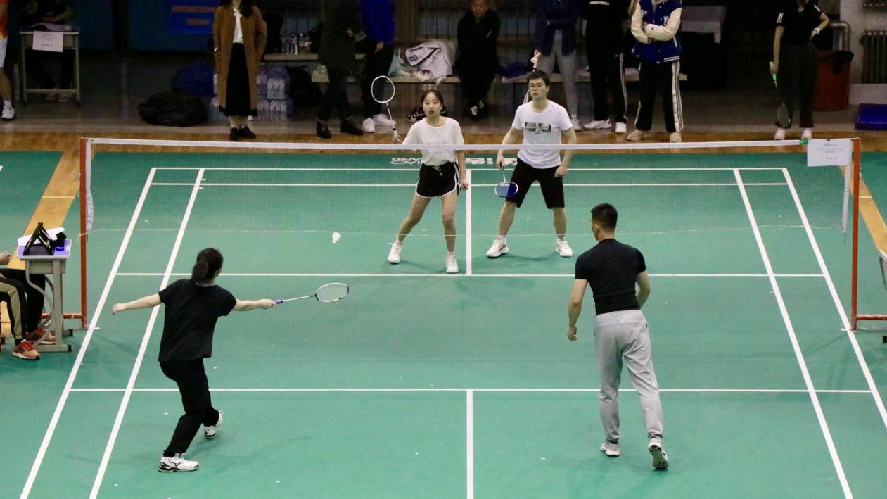 的四位运动员在赛场上挥洒汗水,奋勇拼搏,充分展示了体育健儿的青春风采,为在场同学们来了一场竞技性与观赏性兼具的表演赛。随后正式比赛拉开帷幕,本次比赛主要以羽毛球团体赛为主要赛事形式,包括了“男子双打”、“女子双打”、“混合双打”三类赛事。比赛共分三个阶段进行,第一阶段小组循环,每组取胜场次数多的前两名进入第二阶段比赛;第二阶段淘汰赛,由比赛八强选手晋级第三阶段比赛。第三阶段是半决赛和决赛,产生本次比赛的团体冠、亚、季军。