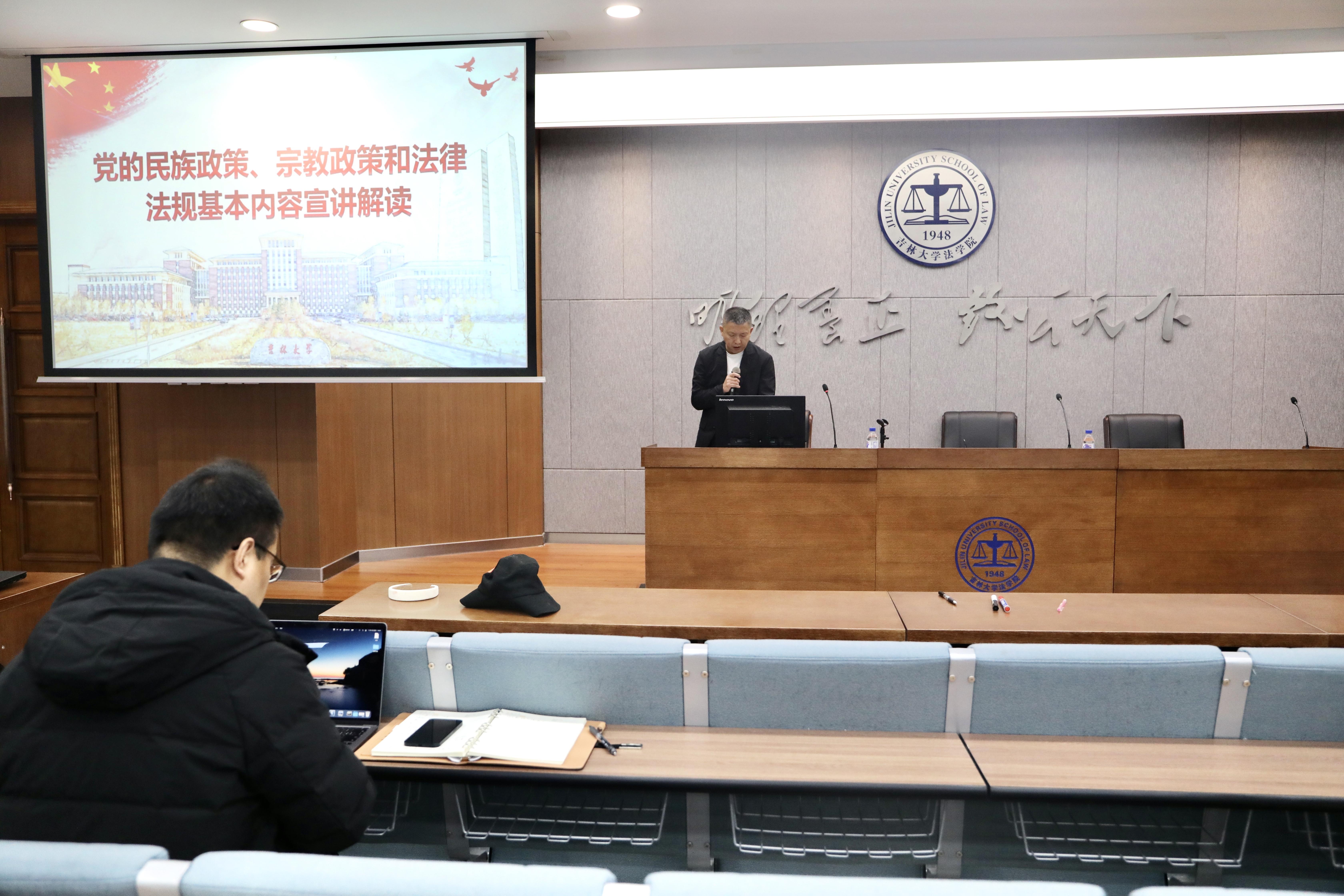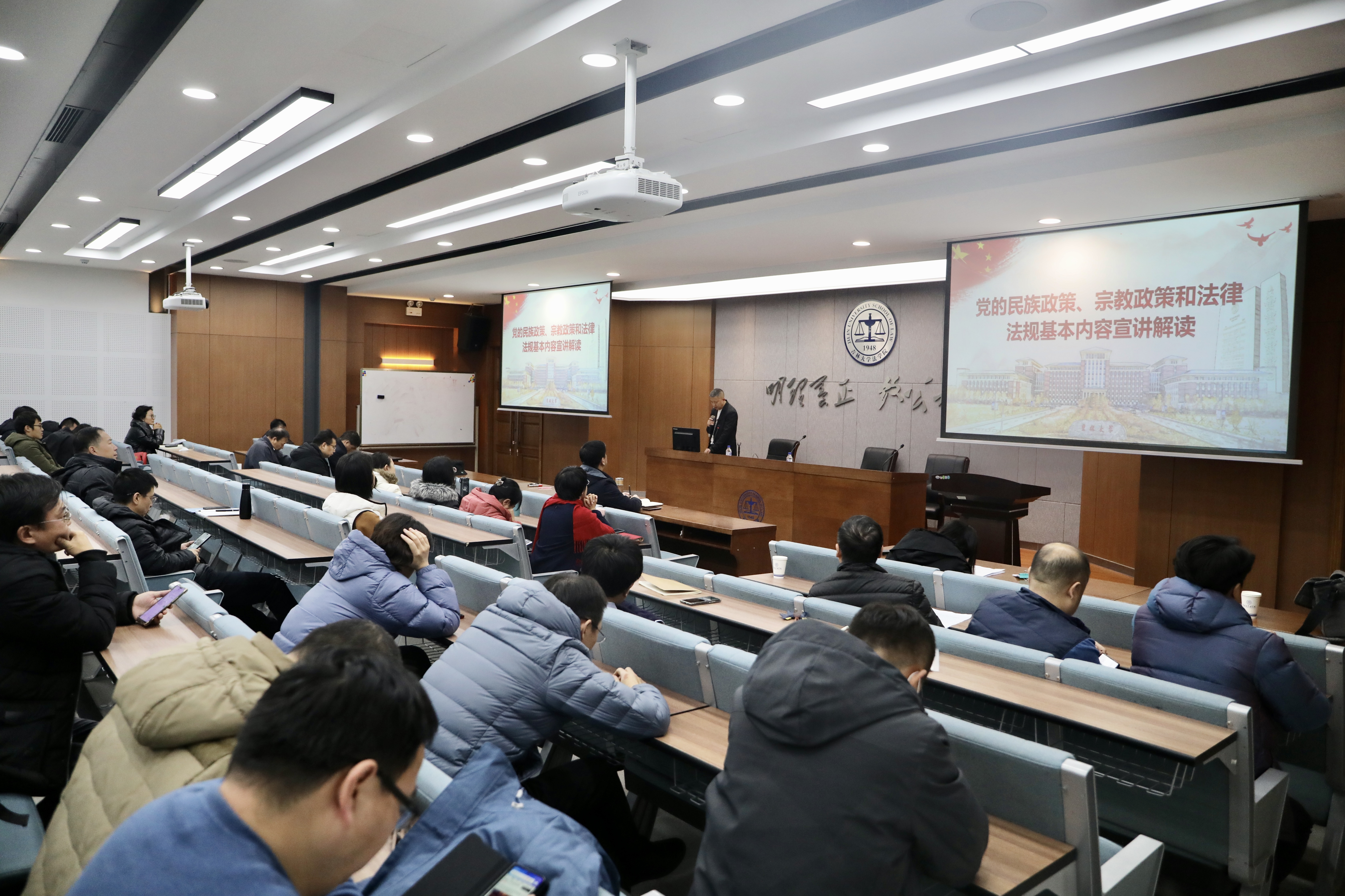 于11月10日下午,在东荣大厦B313教室组织召开全院教职工大会,吕欣副院长和张俊峰副书记分别就高校教师十项准则,党的民族政策、宗教政策和相关法律法规进行宣讲解读。