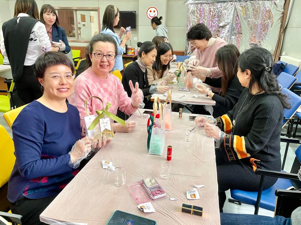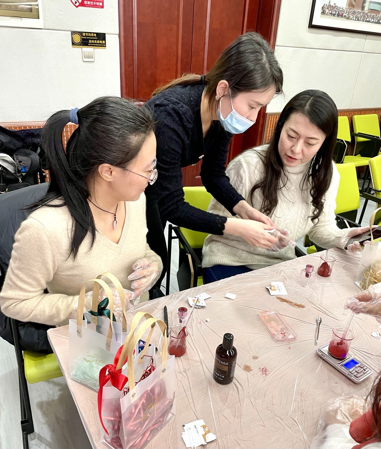 林丽女士从精油口红的制作步骤、选色原则、调制成分的用量和手工制作的注意事项等方面进行了详细的说明,同时普及了精油的养生功效。教师们认真聆听,兴致盎然,在指导下戴好一次性手套对烧杯进行消毒,按照程序先后倒入椰子基底油、选色添加色粉、均匀搅拌、加入蜂蜡、加热溶解、滴入精油搅拌、倒入模具、等待冷冻、装罐。在等待冷冻期间,林丽女士讲授并演示化妆的方法,同时分享了个人在美妆焕发活力提升气质方面的心得体会。教师们全情投入,既增进了工作之余的沟通交流,又舒缓了平日的疲惫与压力,为生活平添了一份明媚的色彩。当教师们怀着期待的心情打开装罐后的口红成品时笑靥如花,这份节日专属的礼物记录着手工制作的乐趣也蕴含着个人独特的审美追求。
