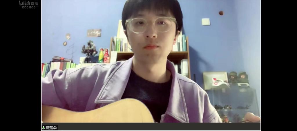 接下来,方正亮同学在隔离酒店为大家带来一首声情并茂、温柔而饱含力量的《且听风吟》。傅佳伟和周广童同学则为大家带来吉他弹唱表演《平凡之路》和《500 miles》,略带忧郁而又哀而不伤的曲调勾起了同学们内心深处的记忆。