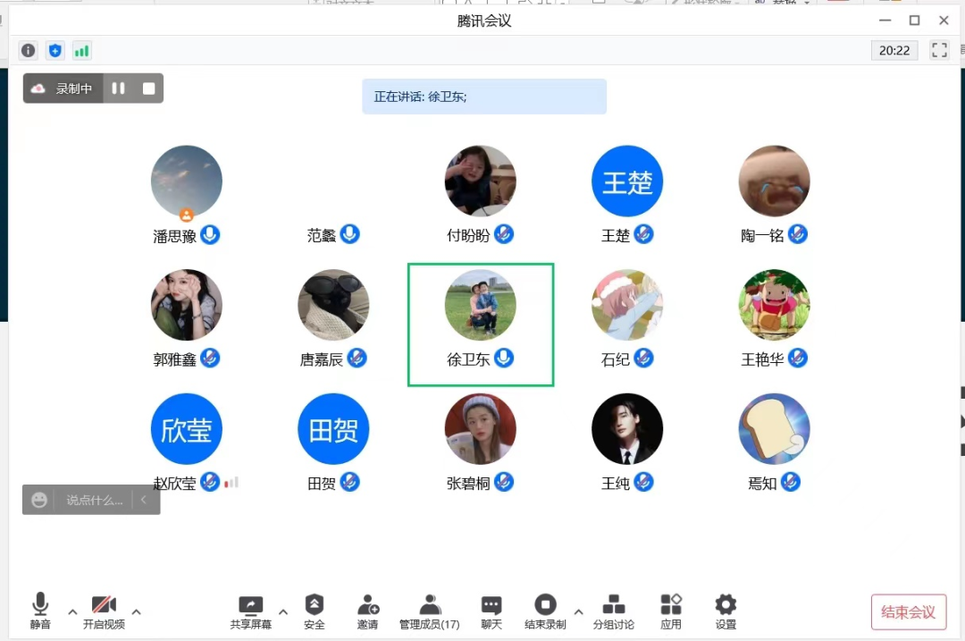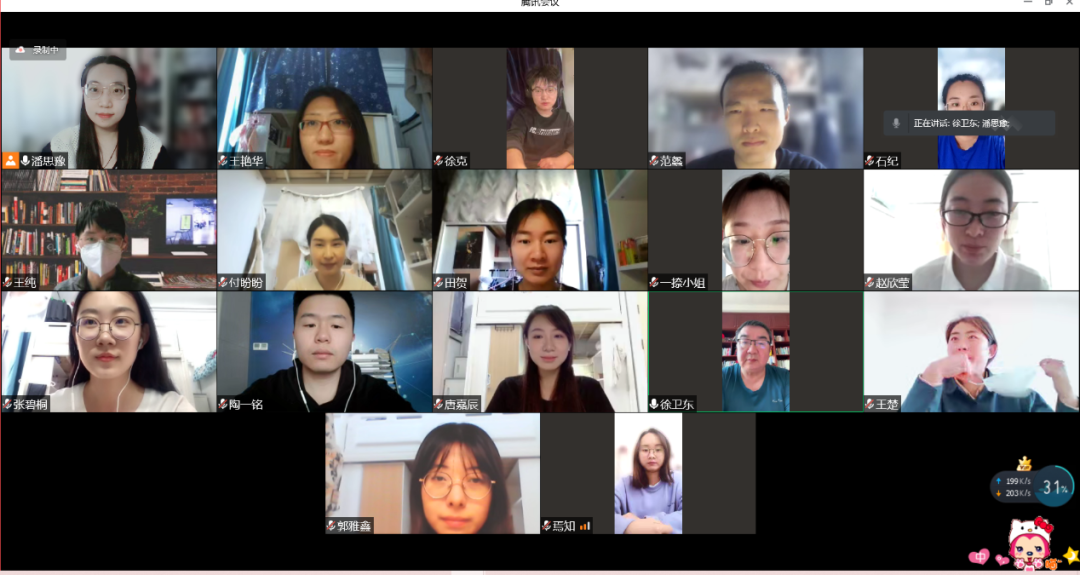 徐卫东教授通过腾讯视频的线上会议组织师门博士硕士研究生进行了一场案例分析研讨会,2020级博士生潘思豫、2021级博士生范蠡参与组织并主持了会议,在寝室封闭的一、二年级硕士生全部出席并积极参与到了研讨会中来。