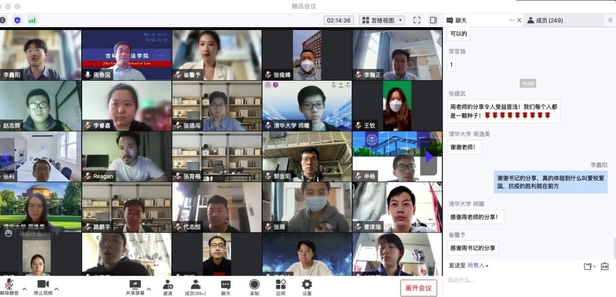 联合清华大学博士生讲师团在腾讯会议举行“云端战疫”思政课,对疫情期间涌现的广大志愿者的先进事迹和精神进行凝练总结。院党委书记周春国、党委副书记张俊峰、研究生辅导员徐晋、于洋,以及成人抖音