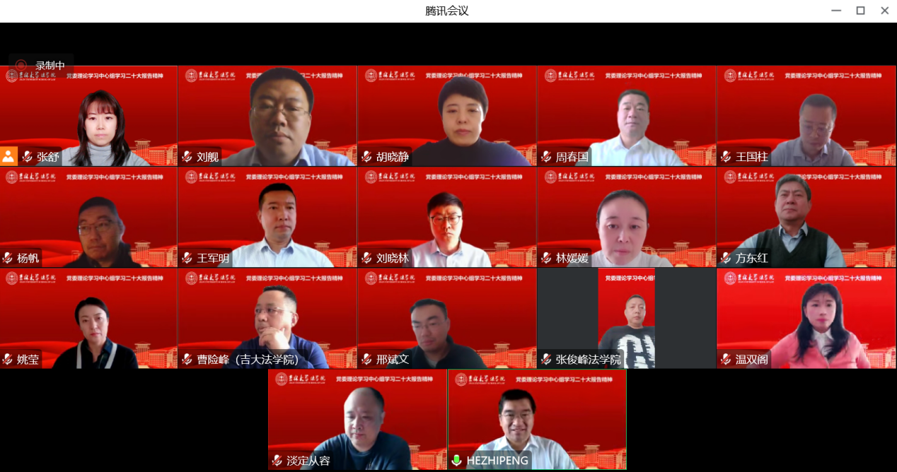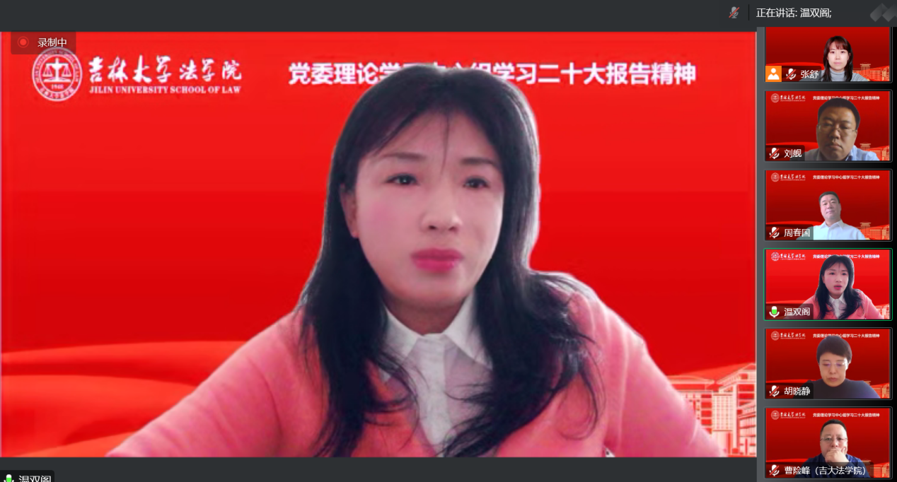 温双阁副院长表示聆听二十大报告倍受鼓舞,是一场生动的爱国主义教育,激励我们要不忘初心、牢记使命。她谈到,报告不仅站在了民族复兴、百年变局的制高点,也为法学工作者指明了方向,启迪思想。同时结合报告具体内容谈了公司法研究新体会,呼吁科研工作者要有跨学科视野,要提高理论研究站位,把个人学术追求和党和国家人民利益联系起来,做到为党和国家建言献策,贡献智慧。