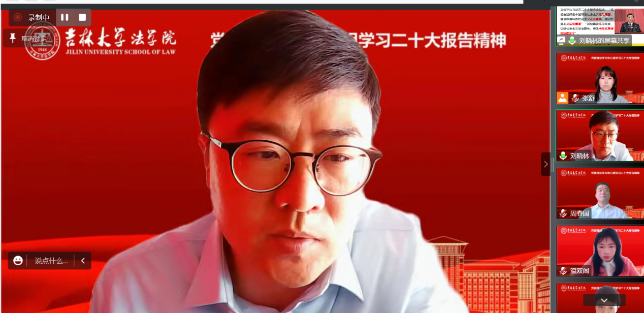 刘晓林副院长结合学科背景交流了对二十大报告主题的理解,他表示全面贯彻新时代中国特色社会主义思想是时代要求,具体工作是全面建设社会主义现代化国家,最终目标是全面推进中华民族伟大复兴。建设社会主义现代化国家就是实现中国式现代化,这在法治领域的体现就是建设中国特色社会主义法治,中国特色社会主义法治需要传承中华优秀传统法治文化,需从传统出发,给予中国特色以合理解释。