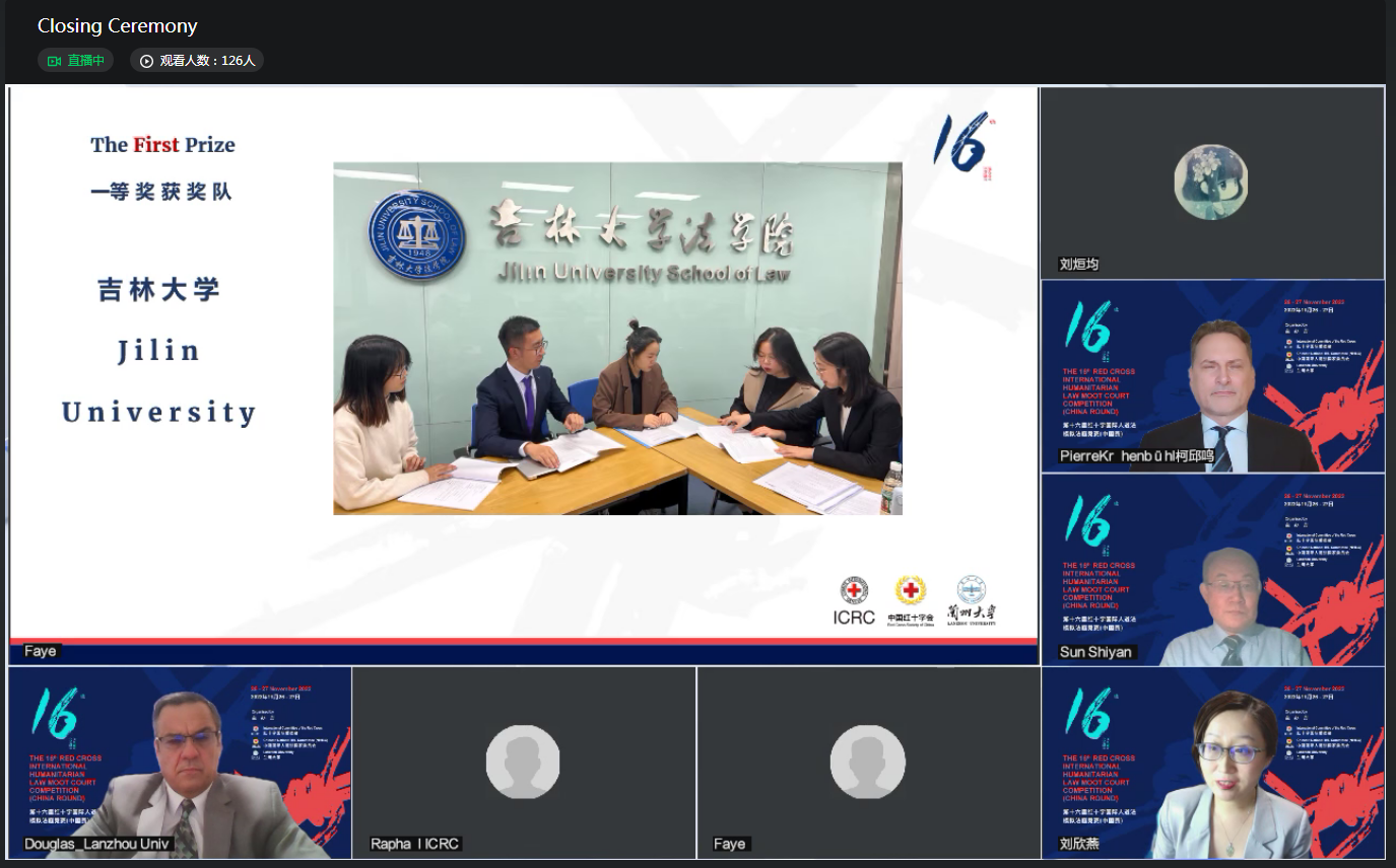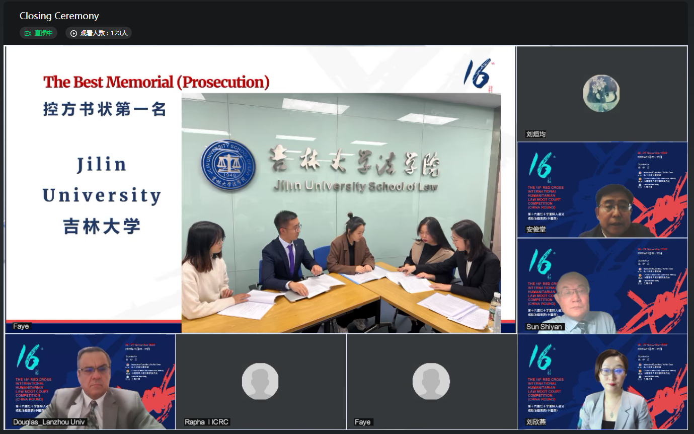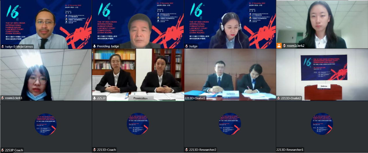 共同主办的第十六届中国大陆地区红十字国际人道法模拟法庭竞赛以线上形式举行,共计60支国内高校代表队参与。各代表队在英文环境下,依据国际人道法、国际刑法等规范,就武装冲突中生态环境的破坏、平民及联合国工作人员的保护地位、被告所应承担的刑事责任等重点及前沿问题进行分析。