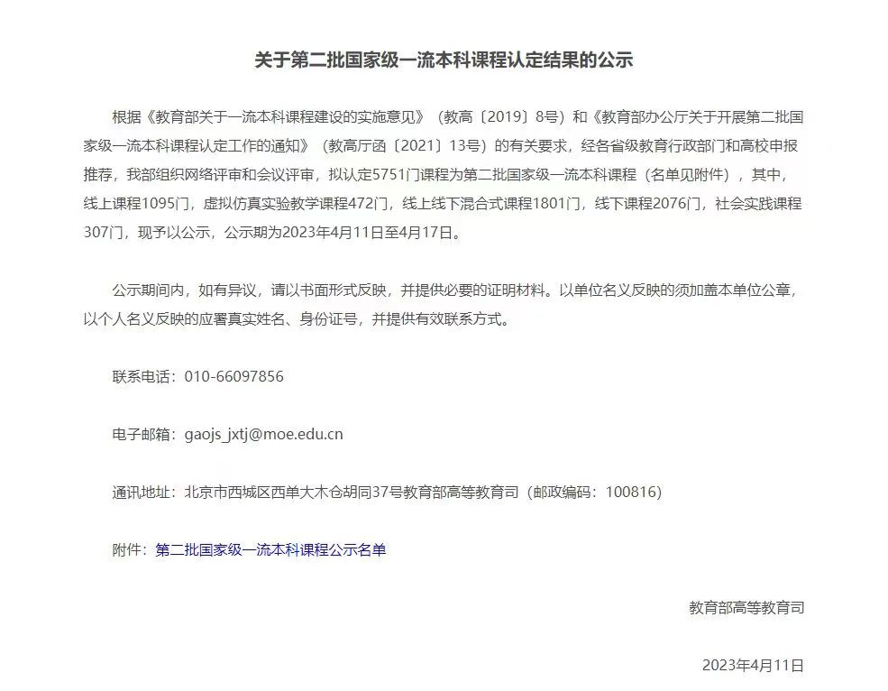 2023年4月11日,教育部高等教育司发布通知,公布了第二批国家级一流本科课程认定结果,共认定线上课程1095门,虚拟仿真实验教学课程472门,线上线下混合式课程1801门,线下课程2076门,社会实践课程307门。其中,何志鹏教授作为课程负责人,王彦志、姚莹、姚璐、崔悦四位老师作为主要成员,部分成人抖音