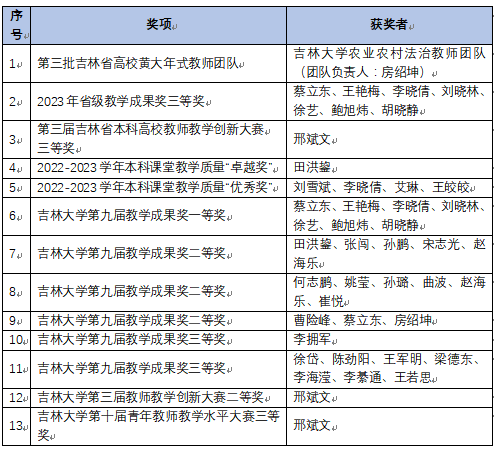 农业农村法治教师团队获得第三批吉林省高校黄大年式教师团队表彰;彭贵才教授、李洪祥教授获得从教40年荣誉徽章;蔡立东教授、王艳梅教授、李晓倩副教授、刘晓林教授、鲍旭炜老师、胡晓静教授共同获得2023年省级教学成果奖三等奖、成人抖音