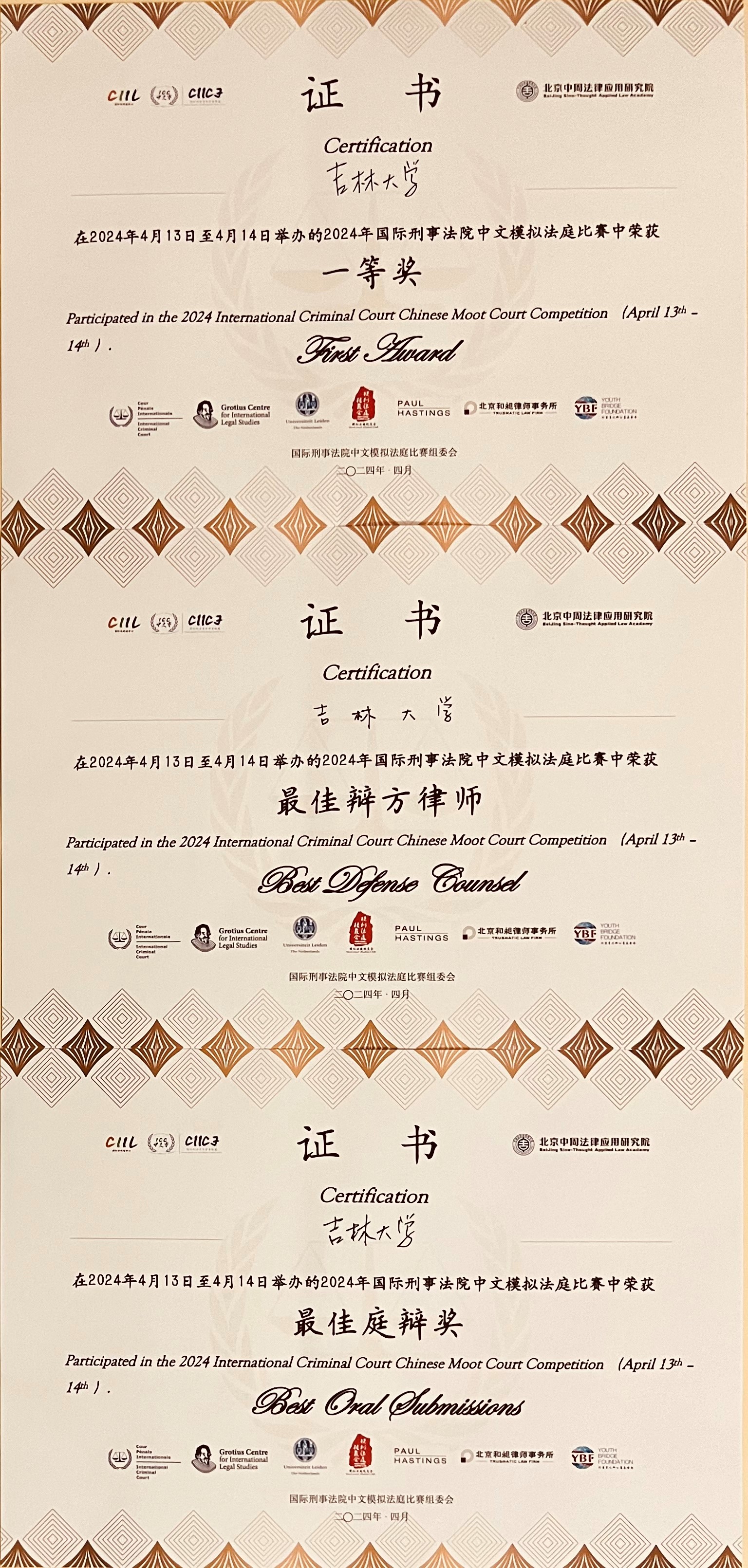 代表队历经2天6场比赛的激烈角逐,顺利突围循环赛、挺进淘汰赛,最终以优异成绩荣获全国一等奖、最佳庭辩奖、最佳辩方律师奖3项团体奖项,顺利晋级海牙国际赛。同时,成人抖音