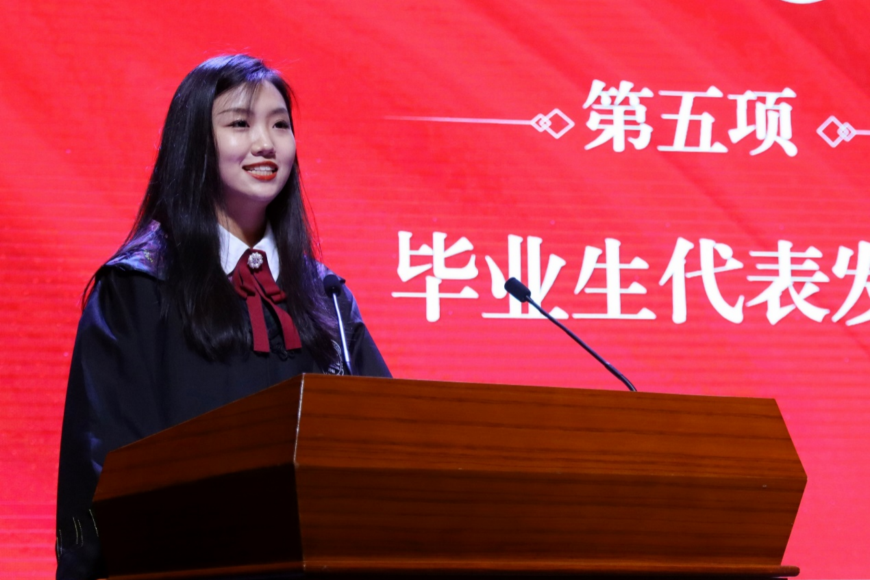 第三十四届学生会主席团成员2020级本科生陈宏钰同学和法律硕士联合会主席团成员2022级硕士研究生雷成同学分别代表毕业生与在校生发言。陈宏钰同学回顾了自己过往四年在成人抖音