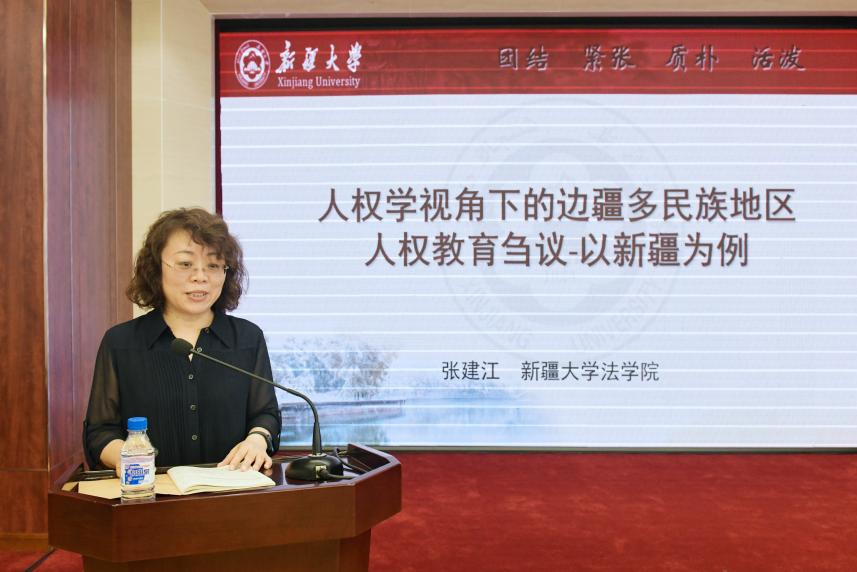 党委书记张建江教授在以“人权学视角下的边疆多民族地区人权教育刍议——以新疆为例”为主题的发言中提出,人权教育是推动人权学科建设的重要路径之一,同时也是人权学科的重要组成部分。然而,新疆地区的人权教育现状与内地一些高校的人权课程、人权学科建设形成了鲜明的对比,新疆地区高校在人权法的课程、教学方面几乎是一片空白。在此情况下,新疆大学增设了有关人权的一系列选修课程,以推动新疆高校人权教育。新疆的人权教育可以为我国人权学科的建设提供丰富的素材,同时在实践上也存在一些特殊性。也正是由于其特殊性,新疆人权教育更应该为推动人权学科建设作出积极贡献,立足新疆实际,积极探索人权专门课程开发。