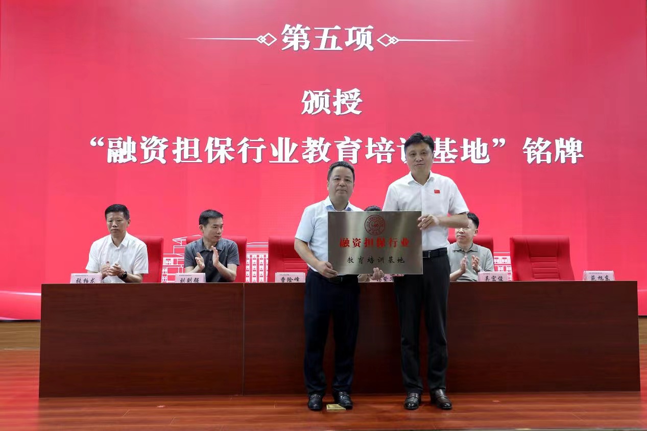 向长春融资担保集团总经理张柏龙颁授了“教学实践基地”铭牌。苑旭东代表长春市信用担保行业协会向曹险峰颁授了“融资担保行业教育培训基地”铭牌。