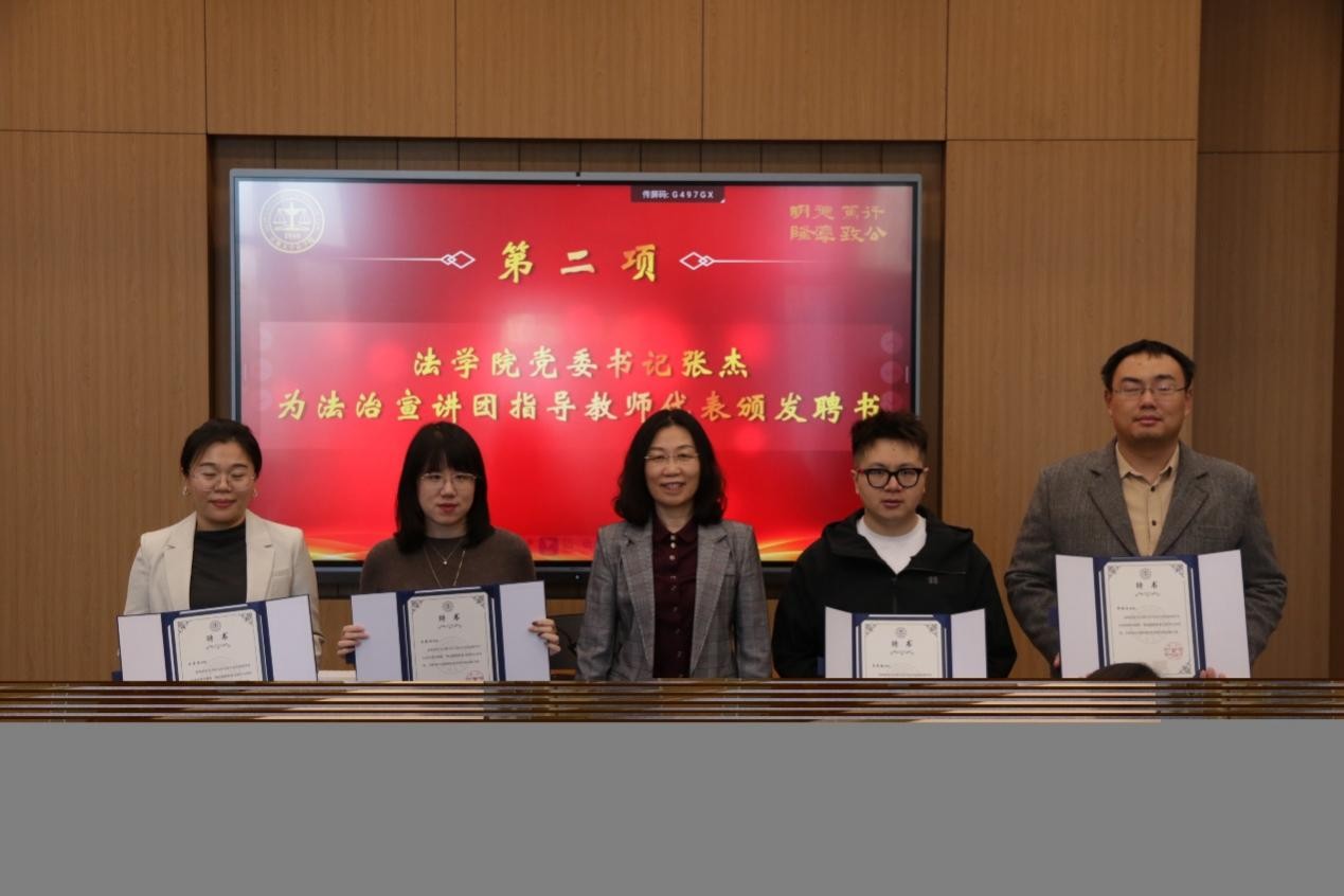 团委副书记曲侠潼参加学习并为宣讲团青年指导教师代表颁发聘书,为宣讲团成员代表颁发宣讲纪念证书,勉励宣讲团要自觉做习近平法治思想的坚定信仰者、积极传播者、模范实践者,推动法治精神在青年中内化于心、外化于行。