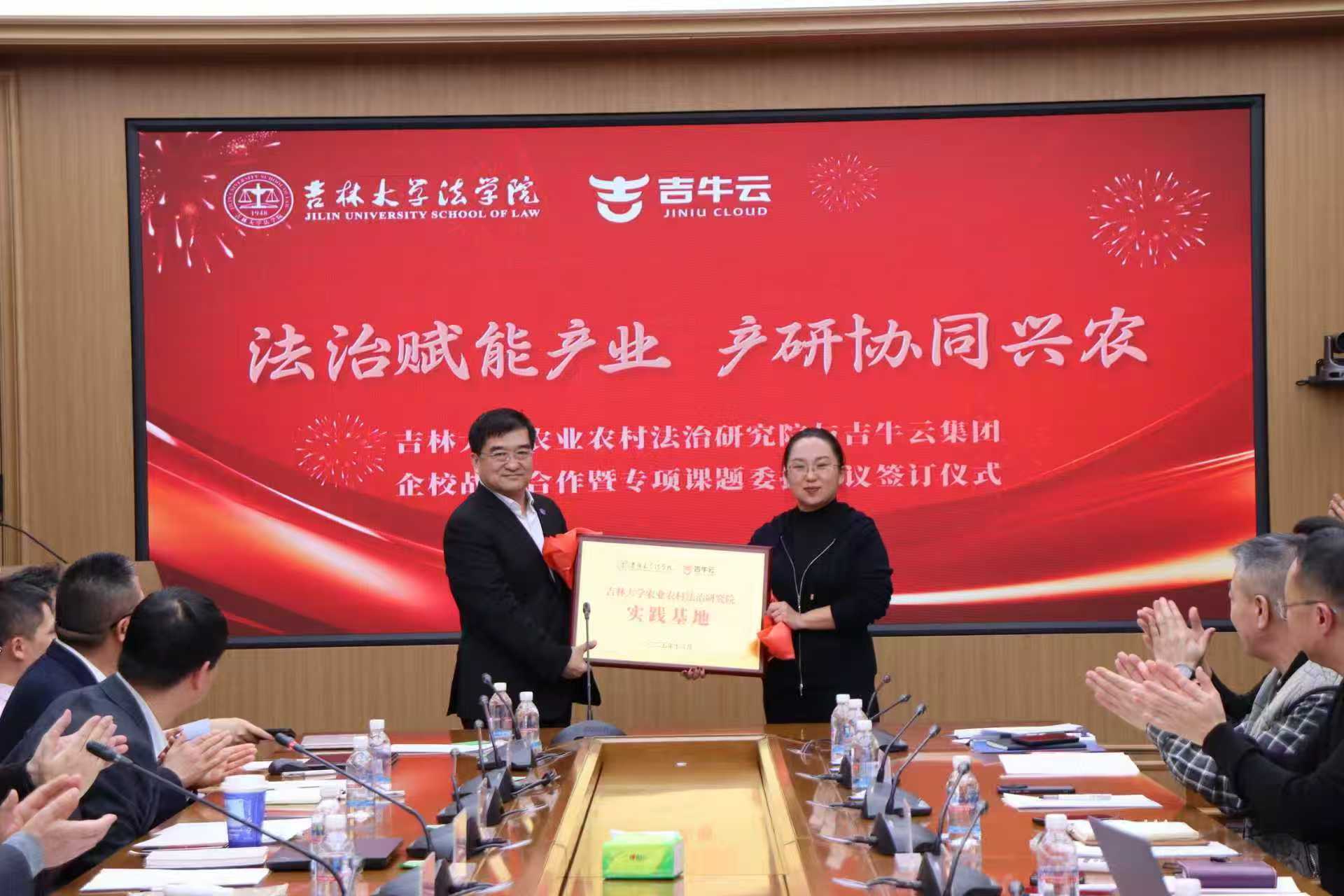 农业农村法治研究院实践基地”牌匾,吉牛云集团董事长李健佳接牌并合影。这一举措标志着双方将共建产研协同平台,为高校人才实践与企业创新发展搭建双向通道。