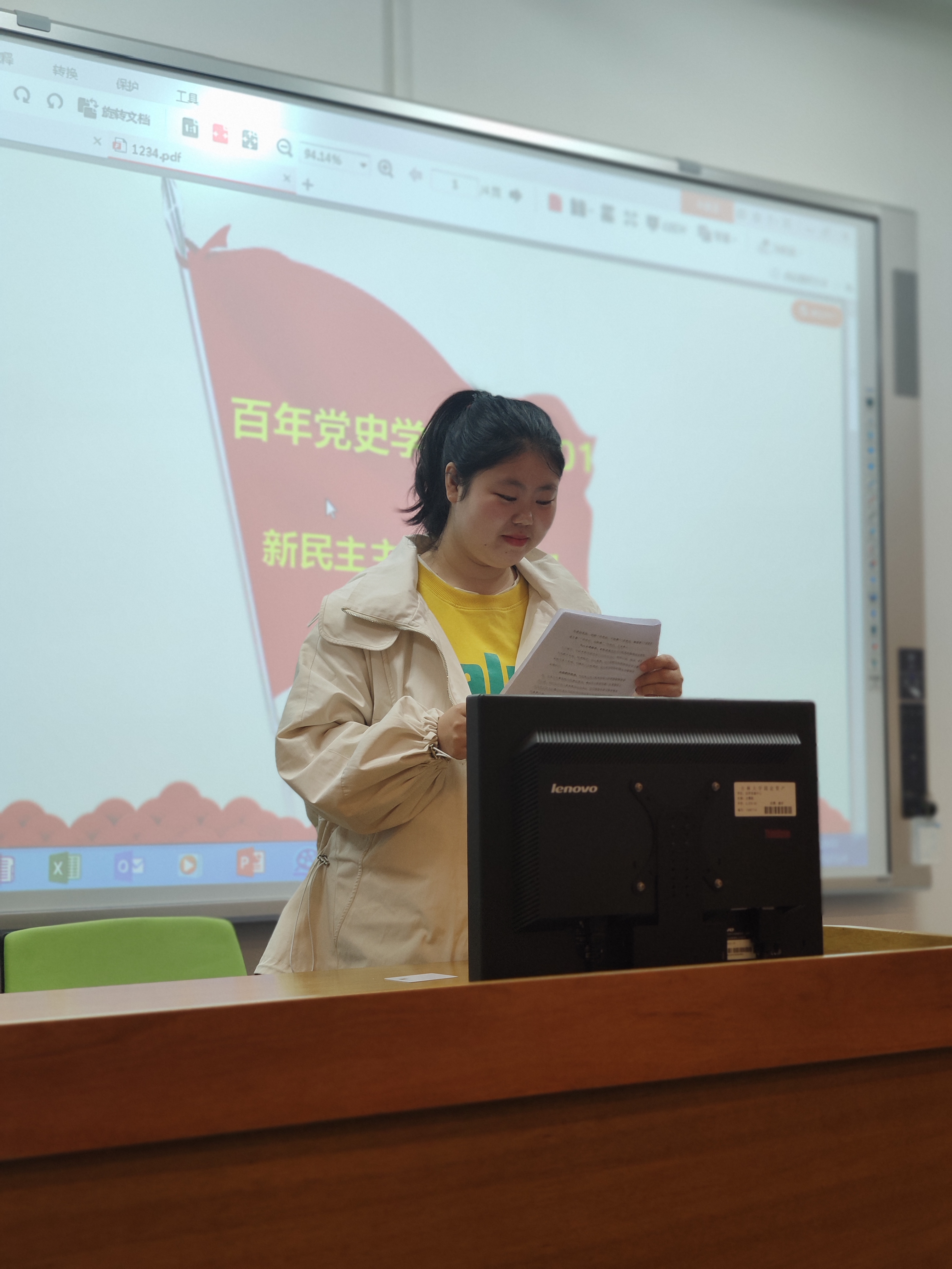 党员郭香玲向就1919—1924年的党史进行了发言,并结合所学内容指出:“青年学生的爱国热忱,以及革命先烈用生命燃起的照破国家昏暗年代的光。创业维艰,筚路蓝缕,我辈应继续为中华民族伟大复兴事业贡献力量。”