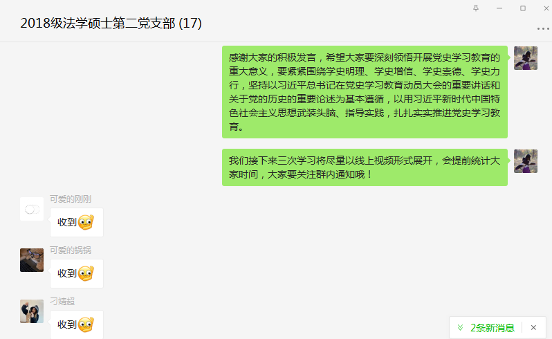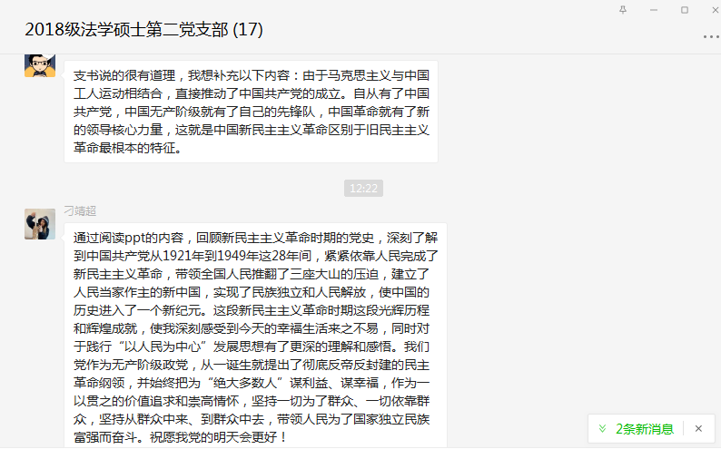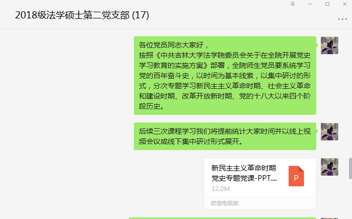 委员会关于在全院开展党史学习教育的实施方案》部署,系统开展全院师生党员要系统学习党的百年奋斗史的活动,2018级法学硕士第二党支部于2021年5月13日线上开展“中国共产党党史学习--新民主主义革命时期”专题学习。本次活动由支部书记吴金晏主持并担任领学,党支部全体成员共同参与。