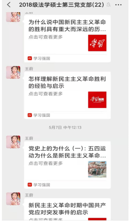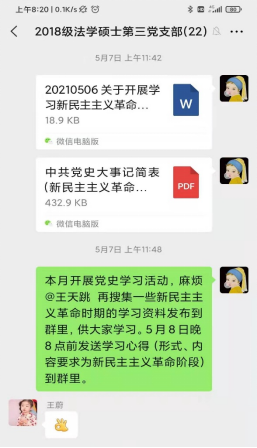 支部书记李莹及时向支部成员传达党委通知,安排组织委员王蔚同学作为领学人,由其负责搜集新民主主义革命时期的历史资料以供各位党员同志深入学习。
