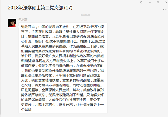 委员会关于在全院开展党史学习教育的实施方案》部署,系统开展全院师生党员要系统学习党的百年奋斗史的活动,2018级法学硕士第二党支部线上开展“中国共产党党史学习--改革开放时期”专题学习。本次活动由支部书记吴金晏主持并担任领学,党支部全体成员共同参与。