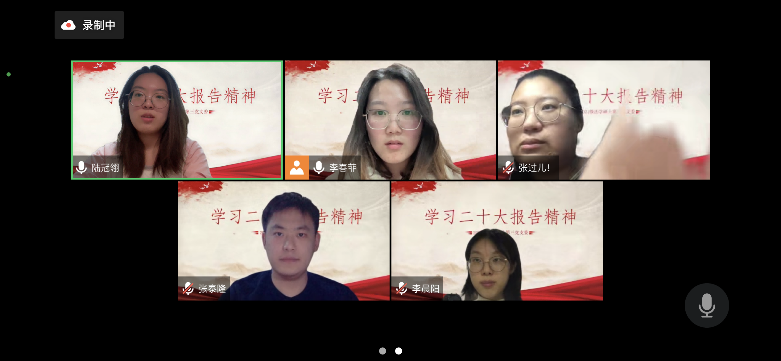 二十大是我们党团结带领人民全面建设社会主义代化国家、全面推进中华民族伟大复兴的整治宣言和行动纲领。入党积极分子周欣从二十大报告结构角度切入,对大会主题、会议历史方位进行阐明,同时向与会人分享了二十大报告中具体十五个部分的详细内容;在法治轨道上全面建设社会主义现代化国家,必须坚持全面依法治国。入党积极分子陈炳旭围绕二十大报告“坚持全面依法治国,推进法治中国建设”部分,分享了个人学习心得体会,表明作为一名法学生一定认真学习专业知识,为法治建设贡献自己的力量。黄麟惠同志作为对话党员真切地分享自己的体会,二十大报告强调教育优先发展,坚持人才强国,坚持为党育人,作为一名研究生要增强个人科研能力,实现创新发展,才能实现国家发展与个人发展同轨,为国家发展助力;李晨阳同志作为对话党员,认为我们不仅应当意识到二十大会议的重要意义,更要认真学习二十大报告,领悟新表述新概括新论断,承担青年责任,作为法学学子更要为国家法治建设添砖加瓦;李春菲同志对话并做总结发言,其对“中国式现代化”的丰富内涵进行了详细的讲解,同时强调砥砺前行路上,大家一定要紧扣“中国式现代化”的内涵,有富足的精神追求和丰富的精神生活,不要成为社会学家描述的那种“单向度的人”,支部党员及积极分子务必以“踔厉奋发、勇毅前行”的精神面貌学习生活,做怀抱梦想又脚踏实地的新时代好青年。