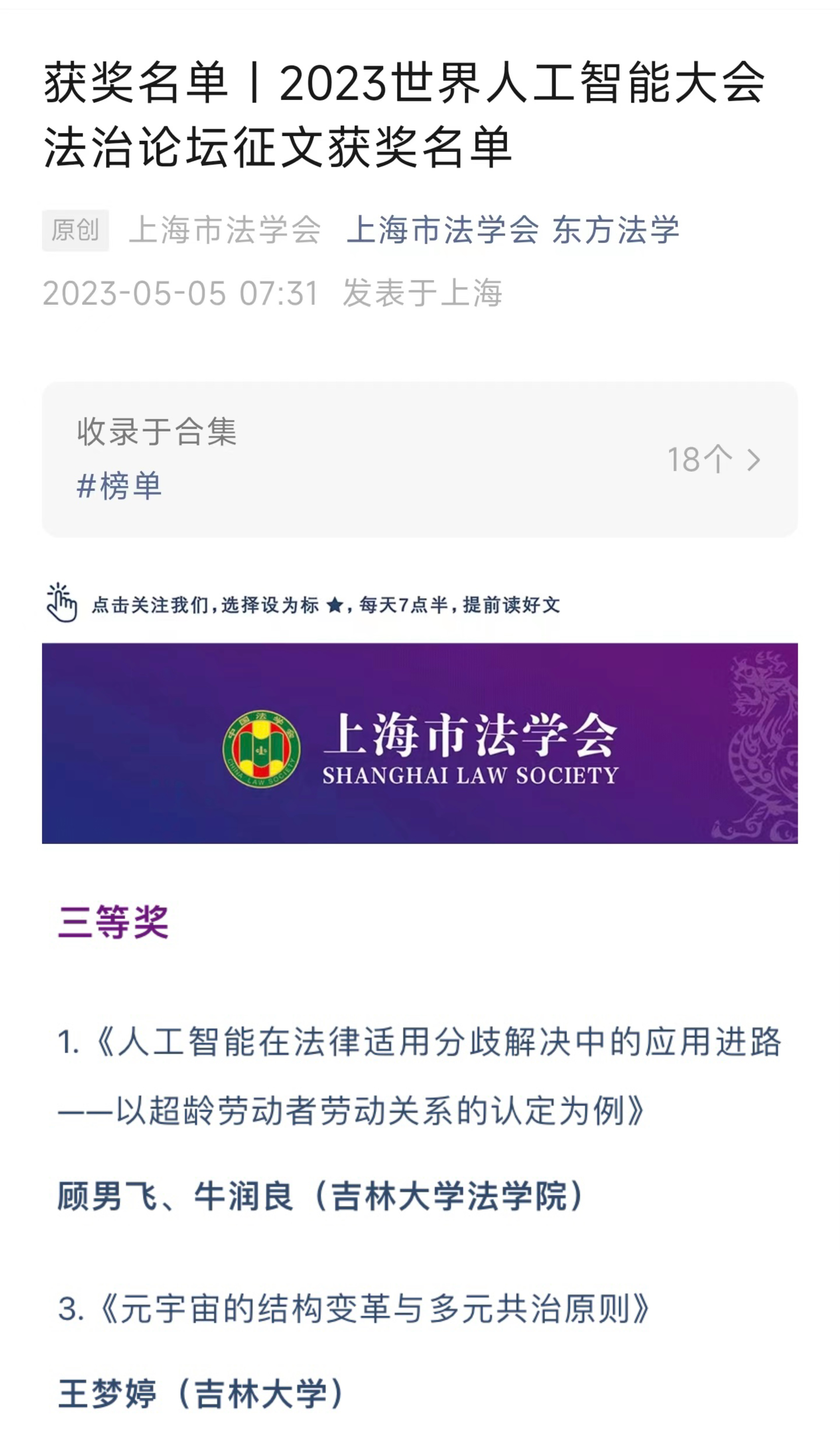 本次征文活动,由上海市法学会发起,获得国内外法律界各方人士踊跃参与,经初步筛选符合征文活动评奖条件的原创作品共118篇。经多名专家匿名评审,共评出一等奖论文2篇、二等奖论文4篇、三等奖论文8篇以及优秀奖16篇。成人抖音