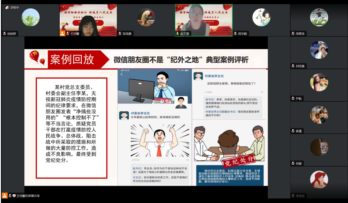 2022级法学硕士各党支部于5月26日举办“深学细悟守初心 铸魂育人促发展”联合线上党日活动,旨在引导全体党员和积极分子学出更加坚定的政治忠诚,学出更加自觉的纪律意识,学出更加过硬的能力作风,学出更加强烈的责任担当。本次活动由2022级法学硕士第三党支部书记王珂馨主持。