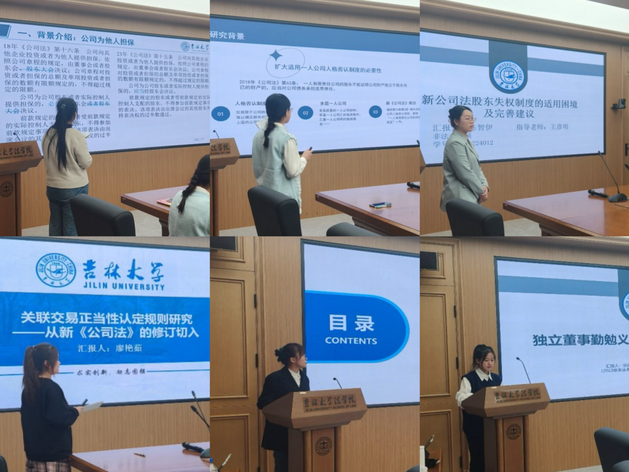 石自国同学以“上市公司非正当关联交易的法律规范——以对控股股东的制约为契入点”为题,于轩同学以“新就业形态下休息权实现的权利基础和救济途径”为题,东芳玉同学以“关联公司法人人格否认规则的司法适用研究”为题,叶逸浩同学以“董事义务及关联交易问题研究”为题,杜鑫瑜同学以“新业态劳动者权益保障检察公益诉讼之证成”为题,吴禹萱同学以“劳动者离线权法律保护研究”为题进行汇报。