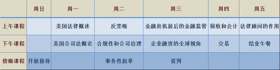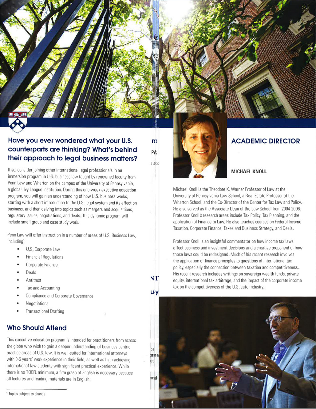 暑期美国商法证书班,为期一周。这个针对处理国际业务的法律执业者开设的美国商法,将使与会者了解到美国商业是如何运作的。首先是一个简短的美国法律体系介绍及其对商业的影响,然后深入研究主题,例如并购、监管问题、谈判和交易。该课程由宾夕法尼亚大学成人抖音