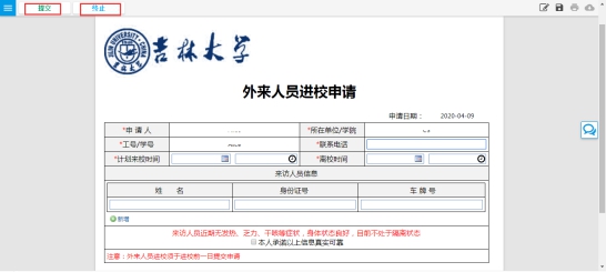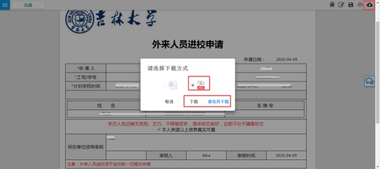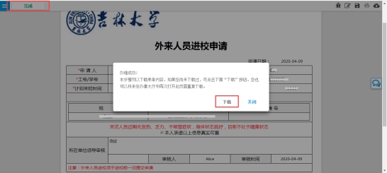 外来人员入校许可》 或是点击完成办理后时直接下载,如下图所示: