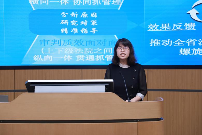 江苏省南通市中级人民法院审判委员会委员、审判管理办公室主任陆炜炜以《持续优化审判质量管理指标体系的实践探索》为题,聚焦厘清指标体系作为审判管理手段而非目的之定位,构建“点线面”三维融合监管体系,实现从数据评估向管理中枢的效能跃升。