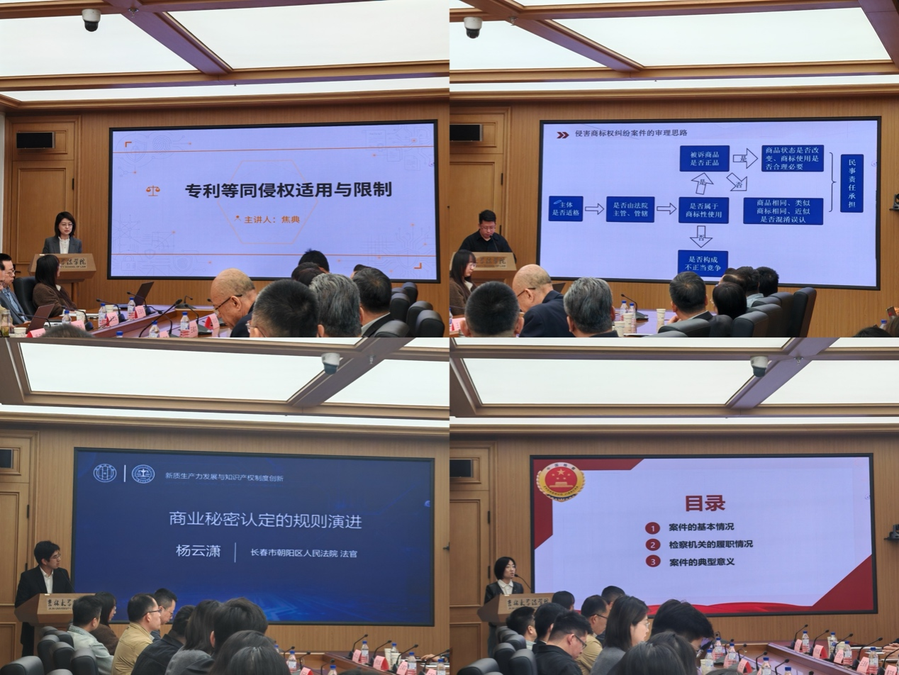姜万国教授主持。长春市中级人民法院焦典法官围绕专利等同侵权的适用与限制,结合典型案例阐释专利等同侵权的“三基本+显而易见”判断标准及禁止反悔原则、捐献原则等;长春市新区人民法院陈佳骐法官系统梳理商标权纠纷审理要点,详解商标性使用、混淆判定及各类抗辩规则;长春市朝阳区人民法院杨云潇法官介绍了商业秘密保护规则的演进,指出当前已确立商业秘密整体性保护原则,商业秘密的认定由碎片化转向整体密点保护;长春市新区人民检察院何兆云主任重点介绍“知益综合履职中心”履职实践,分享了潮玩手办著作权侵权案件的办理经验,并强调了该案件对于同类案件办理的可借鉴性。长春理工大学成人抖音