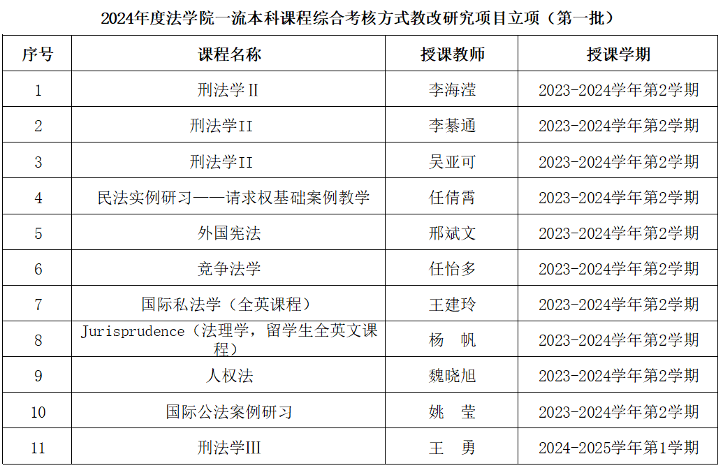为进一步更新教育教学观念,改进教学方法,全面考核学生的知识、能力和综合素质,经授课教师申报,专家组评审,拟确定《刑法学Ⅱ》等11门课程立项,现予以公示。