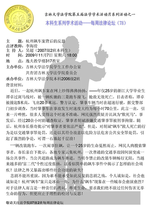 学生工作办公室及院团委主办的本科生“每周法律论坛”第七十八期由06级2班承办,于11月8日在逸夫教学楼317教室如期举行。本期活动由07级2班本科生吴超担任主持人,我们荣幸地邀请到了李海滢老师作为点评嘉宾。