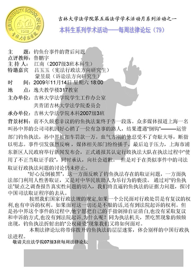 本次论坛聚焦近期备受关注的上海“钓鱼执法”案,通过讨论,使作为未来准法律人的我们对我国行政执法的现状有了更深的了解。语言上激烈的你来我往也引发了大家对公权力的思考。