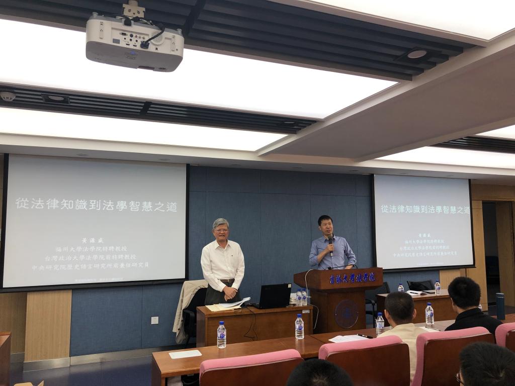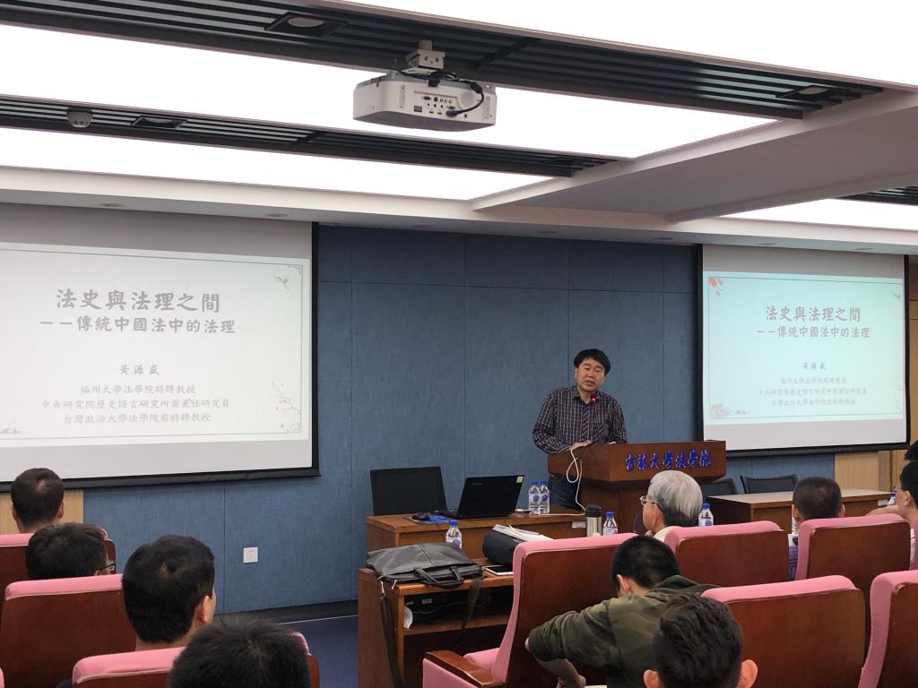 6月20日题为“法史与法理之间—传统中国法中的法理”的讲座由李拥军教授主持,侯学宾教授、朱振教授、吕丽教授、刘晓林教授、刘小平副教授、蔡宏伟老师、邓勇老师、潘宇老师、刘希烈老师与谈评议。在本次讲座中,黄老师开篇提出万事万物皆有因缘,因乃内因,缘乃外力助,因缘和合才有果报。黄老师指出,在台湾地区法理学被称基础法学,理是法之体,体是法之用,要想学好法理学就要掌握四各面向:人性论、价值观、方法论和历史观,即要了解人性善恶、价值多元,要弄清楚法理是科学还是艺术,而且还要在历史的长河中理清其脉络指引其走向,若想读好法学就要有态度、广度和深度。接着黄老师像我们介绍了法理学与法史学在法学体系中的地位,以及传统中国法律史的法理、法律制度中的法,司法裁判中的法理、法律意识中的法理、法律思想中的法理,提出法文化的变动就是法律规范、制度、思想、意识以及司法实践等因素同步发展的过程。对于法史的研究,黄老师指出了法史研究的三阶段,即研究史料(现象世界)、研究史实(根源世界)、研究史观(意义世界)。强调法史的研究既要建立在史料、史实的基础上,又要结合史观探究法律的意义世界。最后黄老师对晚清民国法史若干问题进行了法律省思。