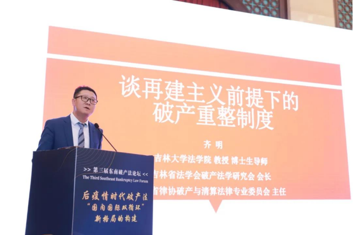 齐明教授在主旨演讲环节发表《谈再建主义前提下的破产重整制度》的主题演讲,从再建主义的内涵、我国重整制度的引进、我国重整制度立法特点、我国重整制度司法实践、问题和解决等五方面进行分享。齐明教授在第二分论坛上担任主持人与发言人就上市公司破产重整与个人破产制度的构建问题展开研讨。