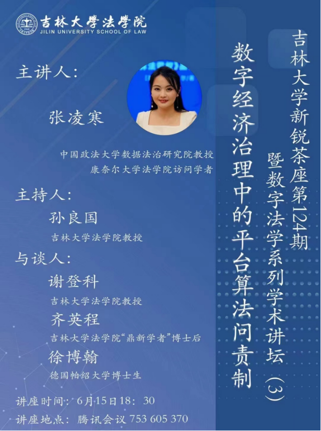 第124期新锐茶座暨第3期数字法学系列学术讲坛,讲座主题为“数字经济治理中的平台算法问责制”。本次讲座由成人抖音