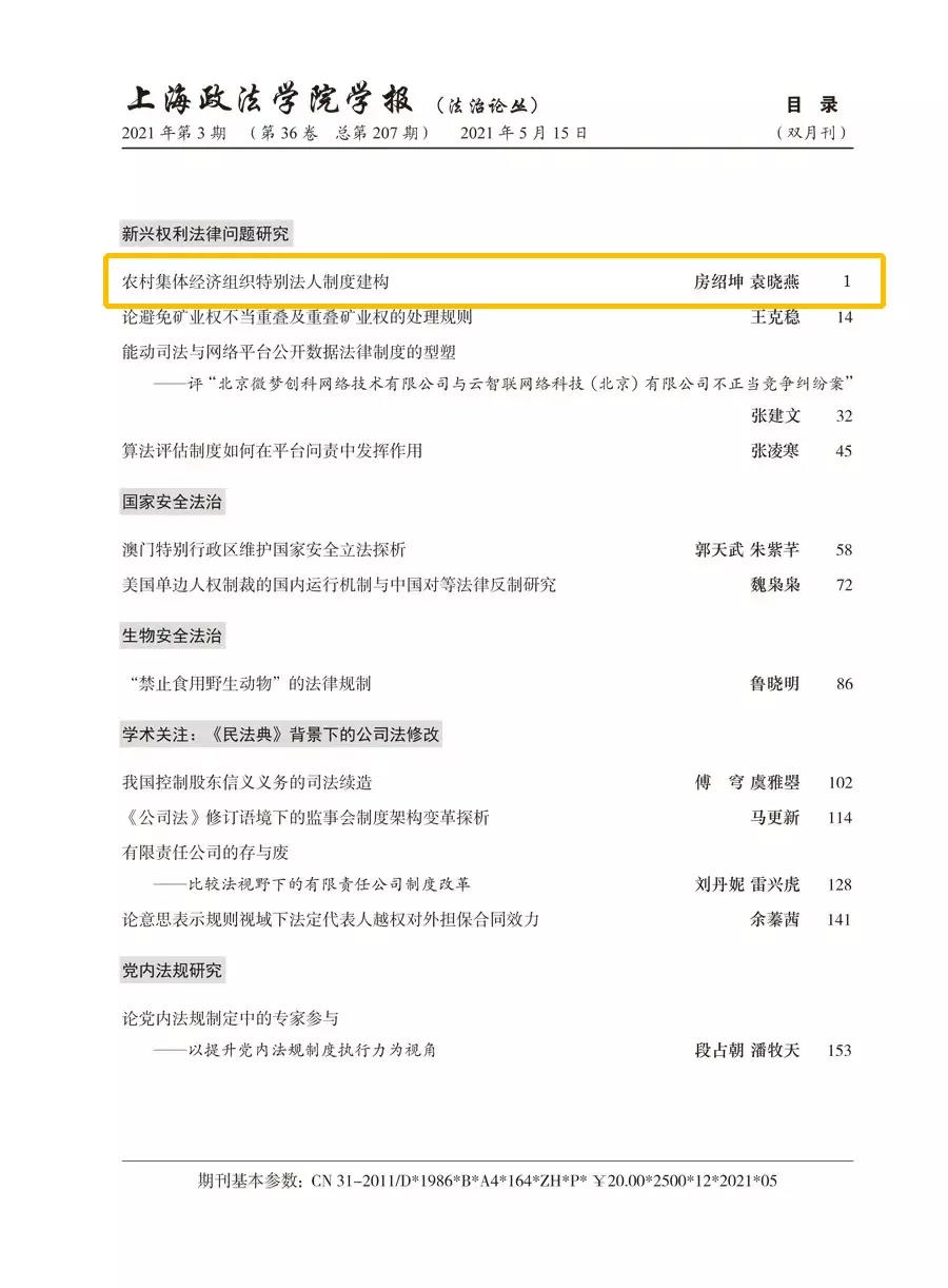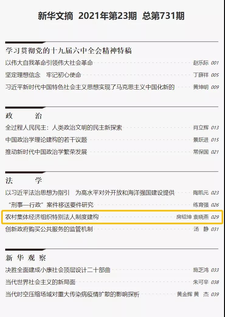 学报(法治论丛)》2021年第3期的“农村集体经济组织特别法人制度建构”一文被《新华文摘》2021年第23期全文转载,该文是房绍坤教授带领团队致力于农村集体产权制度改革法治保障研究的阶段性成果。