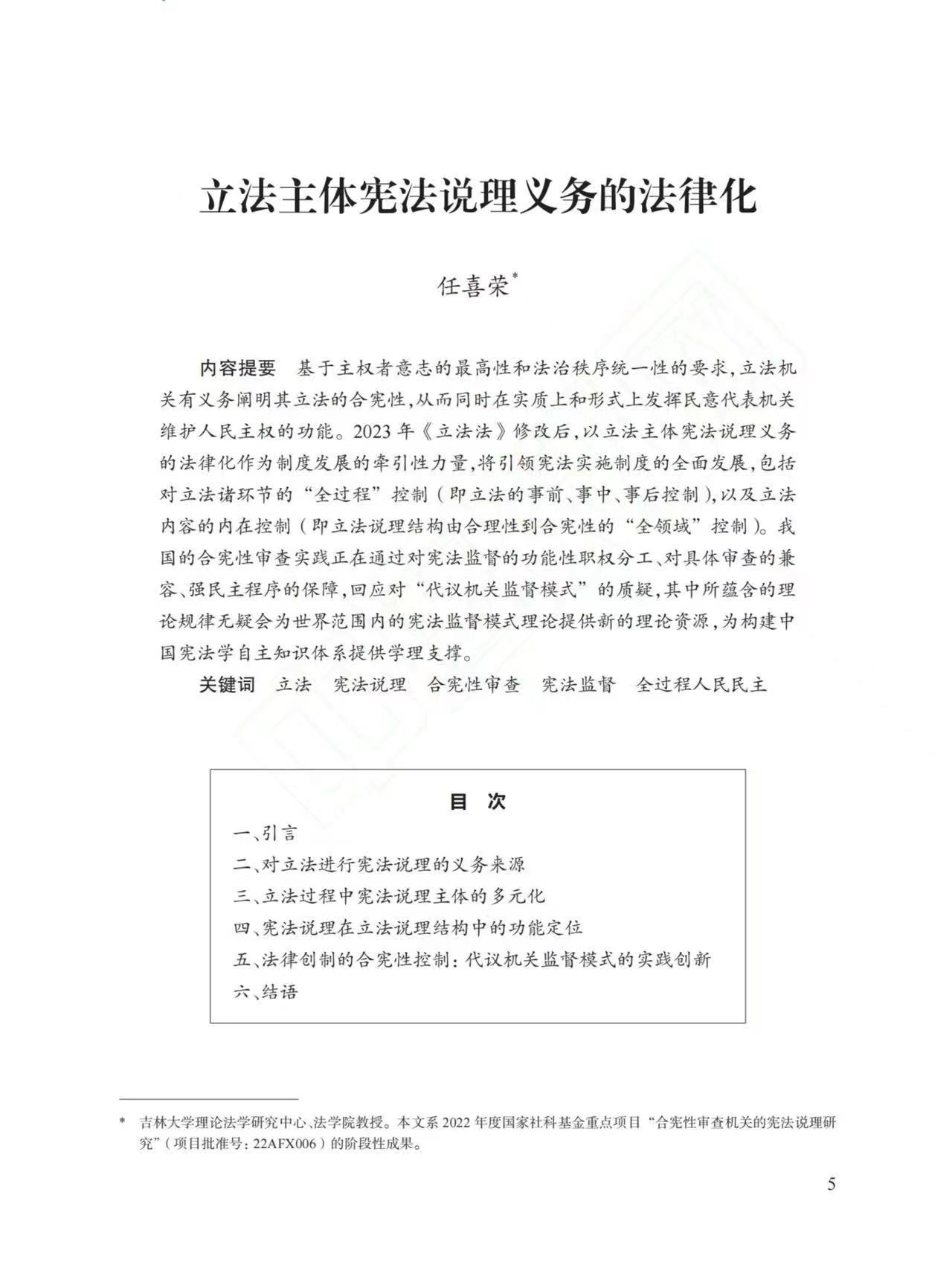 任喜荣教授在《中国法学》2024年第3期发表题为《立法主体宪法说理义务的法律化》的文章。文章以2023年修改的《中华人民共和国立法法》为规范依据,以立法主体宪法说理的义务来源、主体多元、功能定位为研究对象,探讨了我国正在构建的立法的事前、事中与事后的“全过程”合宪性审查机制的实践创新。